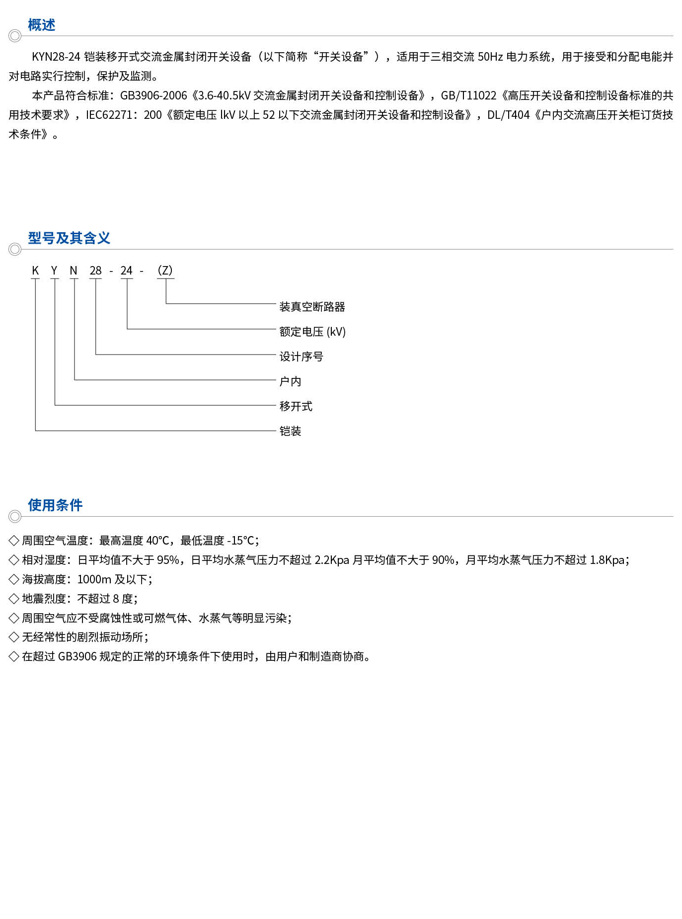 KYN28-24鎧裝移開式交流金屬封閉開關(guān)設(shè)備(以下簡稱“開關(guān)設(shè)備”),適用于三相交流50Hz電力系統(tǒng),用于接受和分配電能并對電路實行控制,保護(hù)及監(jiān)測。本產(chǎn)品符合標(biāo)準(zhǔn):GB3906-2006《3.6-40.5kW交流金屬封閉開關(guān)設(shè)備和控制設(shè)備》,GB/T11022《高壓開關(guān)設(shè)備和控制設(shè)備標(biāo)準(zhǔn)的共用技術(shù)要求》,IEC62271:200《額定電壓kV以上52以下交流金屬封閉開關(guān)設(shè)備和控制設(shè)備》,DL/T404《戶內(nèi)交流高壓開關(guān)柜訂貨技術(shù)條件》。