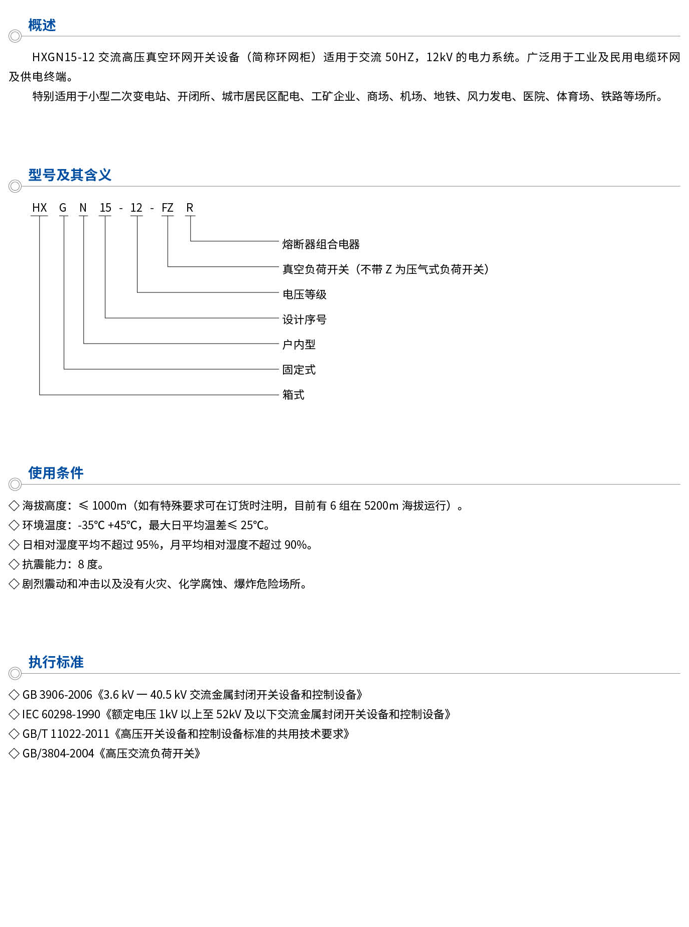 HXGN15-12交流高壓真空環(huán)網(wǎng)開(kāi)關(guān)設(shè)備(簡(jiǎn)稱(chēng)環(huán)網(wǎng)柜)適用于交流50HZ,12kV的電力系統(tǒng)。廣泛用于工業(yè)及民用電纜環(huán)網(wǎng)及供電終端。特別適用于小型二次變電站、開(kāi)閉所、城市居民區(qū)配電、工礦企業(yè)、商場(chǎng)、機(jī)場(chǎng)、地鐵、風(fēng)力發(fā)電、醫(yī)院、體育場(chǎng)、鐵路等場(chǎng)所。