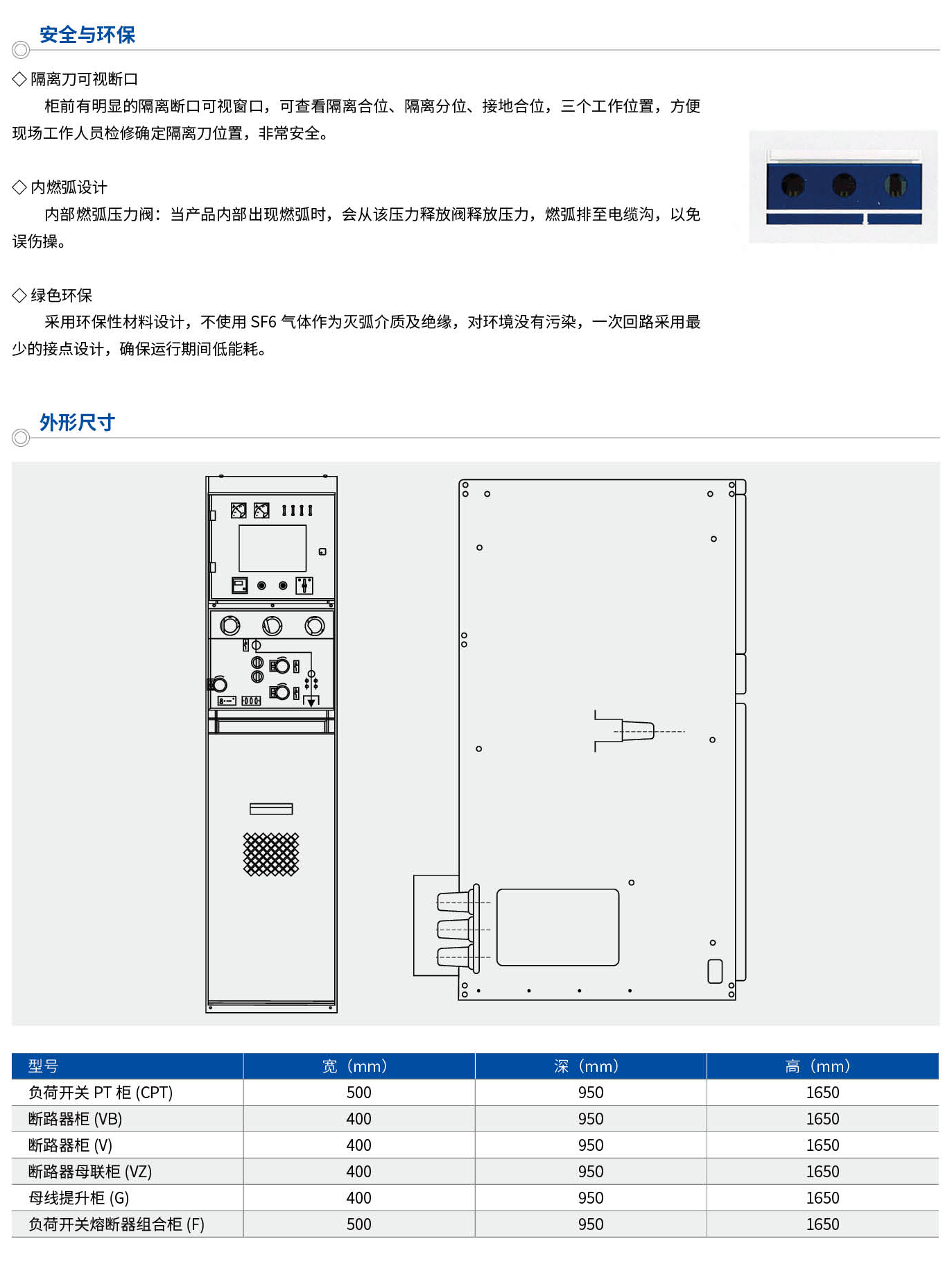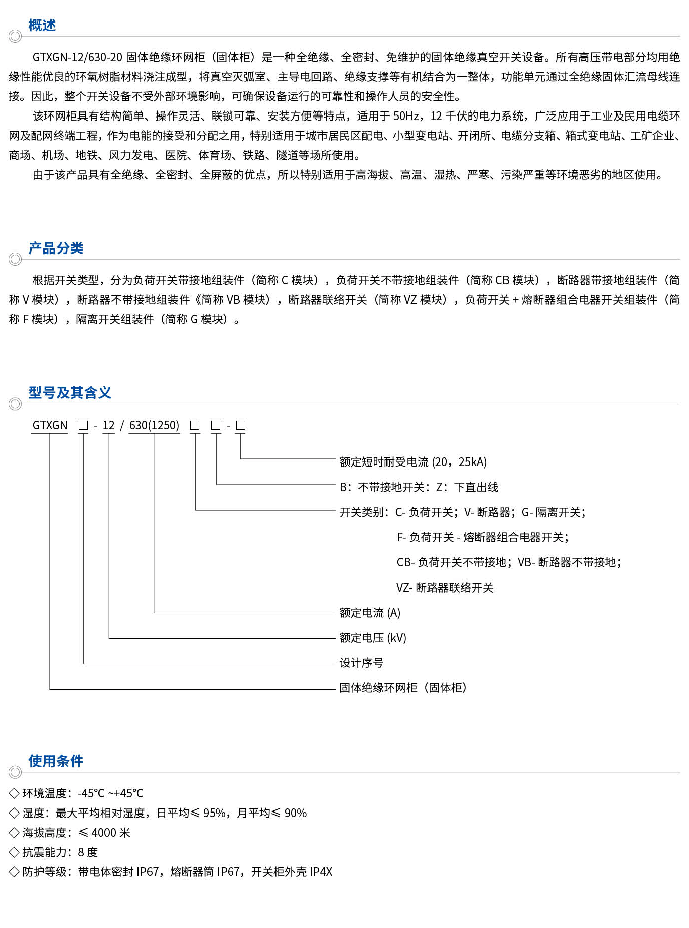 GTXGN-12/630-20固體絕緣環(huán)網(wǎng)柜(固體柜)是一種全絕緣、全密封、免維護(hù)的固體絕緣真空開(kāi)關(guān)設(shè)備。所有高壓帶電部分均用絕緣性能優(yōu)良的環(huán)氧樹(shù)脂材料澆注成型,將真空滅弧室、主導(dǎo)電回路、絕緣支撐等有機(jī)結(jié)合為一整體,功能單元通過(guò)全絕緣固體匯流母線連接。因此,整個(gè)開(kāi)關(guān)設(shè)備不受外部環(huán)境影響,可確保設(shè)備運(yùn)行的可靠性和操作人員的安全性。該環(huán)網(wǎng)柜具有結(jié)構(gòu)簡(jiǎn)單、操作靈話、聯(lián)鎖可靠、安裝方便等特點(diǎn),適用于50Hz,12千伏的電力系統(tǒng),廣泛應(yīng)用于工業(yè)及民用電纜環(huán)網(wǎng)及配網(wǎng)終端工程,作為電能的接受和分配之用,特別適用于城市居民區(qū)配電、小型變電站、開(kāi)閉所、電纜分支箱、箱式變電站、工礦企業(yè)、商場(chǎng)、機(jī)場(chǎng)、地鐵、風(fēng)力發(fā)電、醫(yī)院、體育場(chǎng)、鐵路、隧道等場(chǎng)所使用。由于該產(chǎn)品具有全絕緣、全密封、全屏蔽的優(yōu)點(diǎn),所以特別適用···