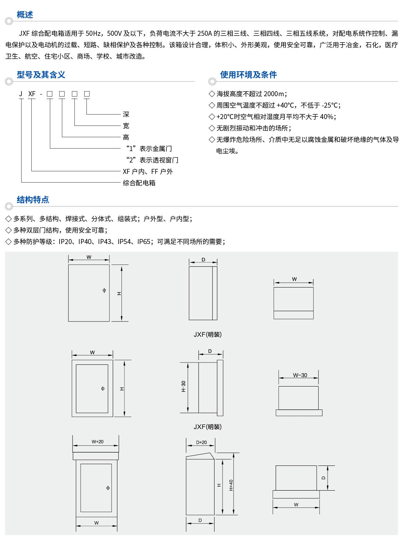 JXF綜合配電箱適用于50Hz,500V及以下,負(fù)荷電流不大于250A的三相三線、三相四線、三相五線系統(tǒng),對(duì)配電系統(tǒng)作控制、漏電保護(hù)以及電動(dòng)機(jī)的過(guò)載、短路、缺相保護(hù)及各種控制。該箱設(shè)計(jì)合理,體積小、外形美觀,使用安全可靠,廣泛用于治金,石化,醫(yī)療衛(wèi)生、航空、住宅小區(qū)、商場(chǎng)、學(xué)校、城市改造。