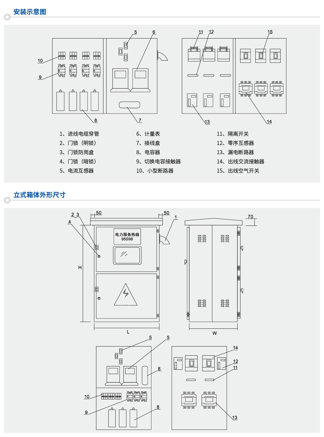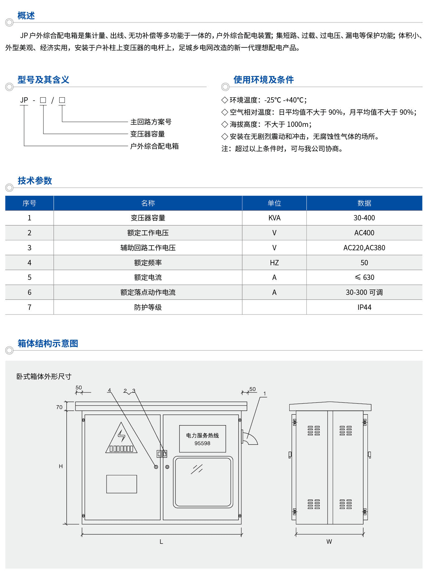 JP戶外綜合配電箱是集計量、出線、無功補償?shù)榷喙δ苡谝惑w的,戶外綜合配電裝置;集短路、過載、過電壓、漏電等保護功能;體積小、外型美觀、經濟實用,安裝于戶補柱上變壓器的電桿上,足城鄉(xiāng)電網(wǎng)改造的新一代理想配電產品。